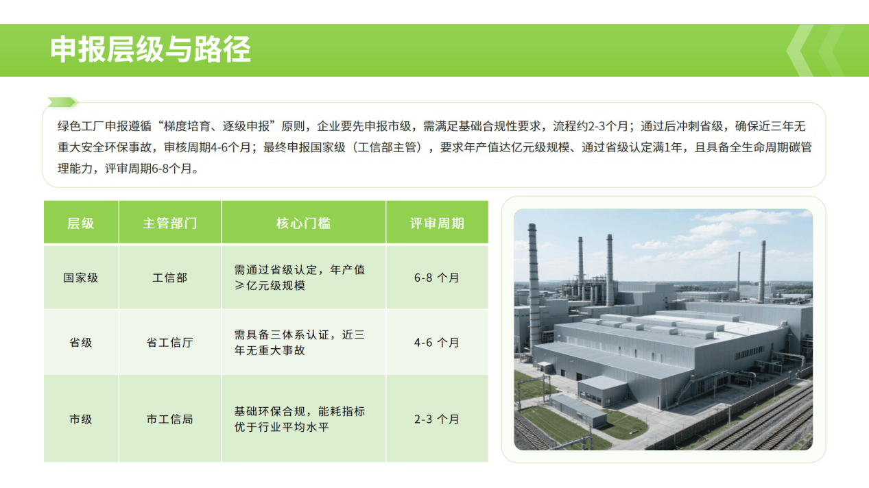 绿色工厂申报是融合政策、管理与技术的系统化工程,遵循“梯度培育、逐级申报”的原则。深圳市绿色工厂申报要求明确,企业首先需向市级主管部门申报(市级绿色工厂),满足基础合规性要求,成功通过市级审核后,可向省级申报,最终向国家级绿色工厂冲刺。