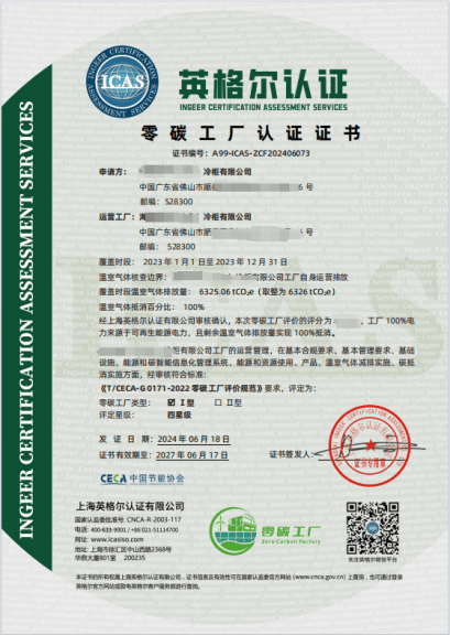 佛山容声冷柜公司成功申报省级绿色工厂,同时也深挖节能降碳潜力,创建零碳工厂。半年内,ICAS英格尔认证为其摸清碳家底颁发温室气体核查证书、中和碳排放颁发碳中和认证、最终容声冷柜获得了零碳工厂认证证书,评定为:四星级Ⅰ型零碳工厂,成为该企业向“净零排放”目标迈出的重要一步。