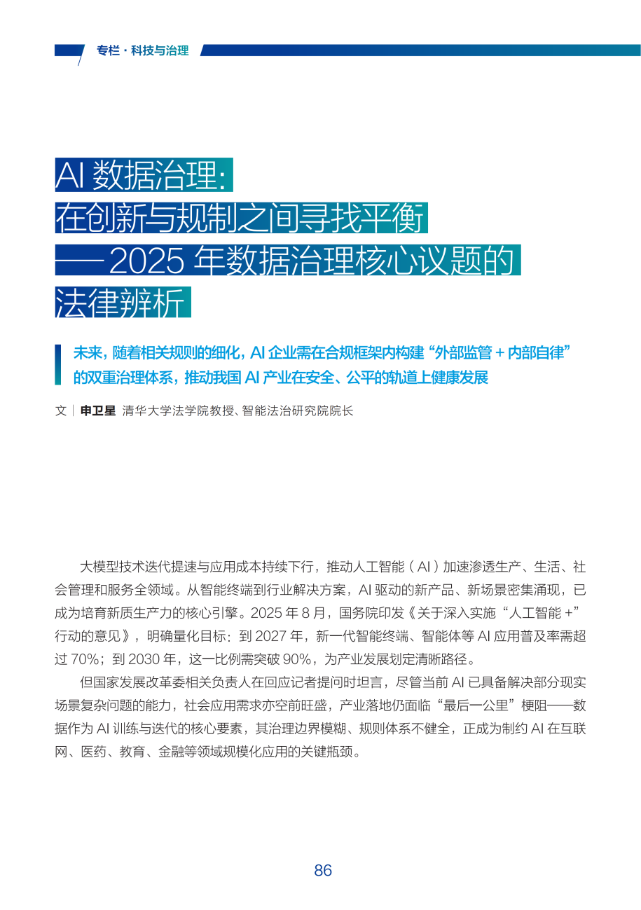 在科技与治理方面,随着AI技术加速渗透各行各业,数据治理成为制约其规模化应用的关键瓶颈。2025年,我国通过立法修订、执法案例与行业标准共同构建起AI数据治理的合规框架,在保障数据安全与个人信息权益的同时,为技术创新留出合理空间。