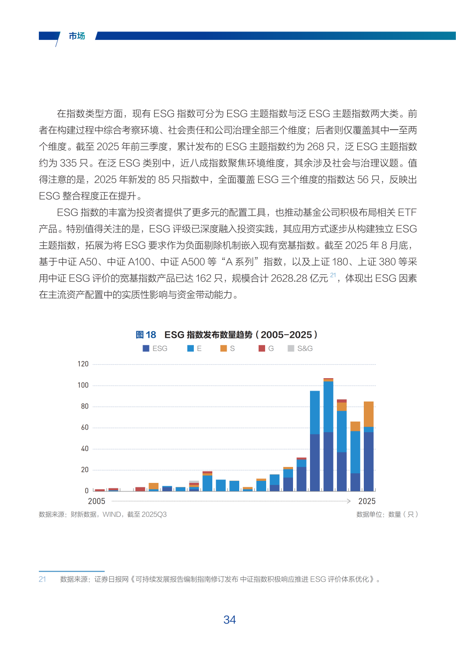 特别是在A股市场,ESG主题公募基金中的头部产品持续跑赢市场基准,展现出较高的风险调整后收益。值得注意的是,ESG因素已深度融入主流投资实践,截至2025年8月底,基于中证ESG评价的宽基指数产品规模达到2628亿元,显示出ESG因子在资产配置中发挥实质性作用,这一变化标志着ESG投资逐渐成为了影响整体资本市场的重要变量。