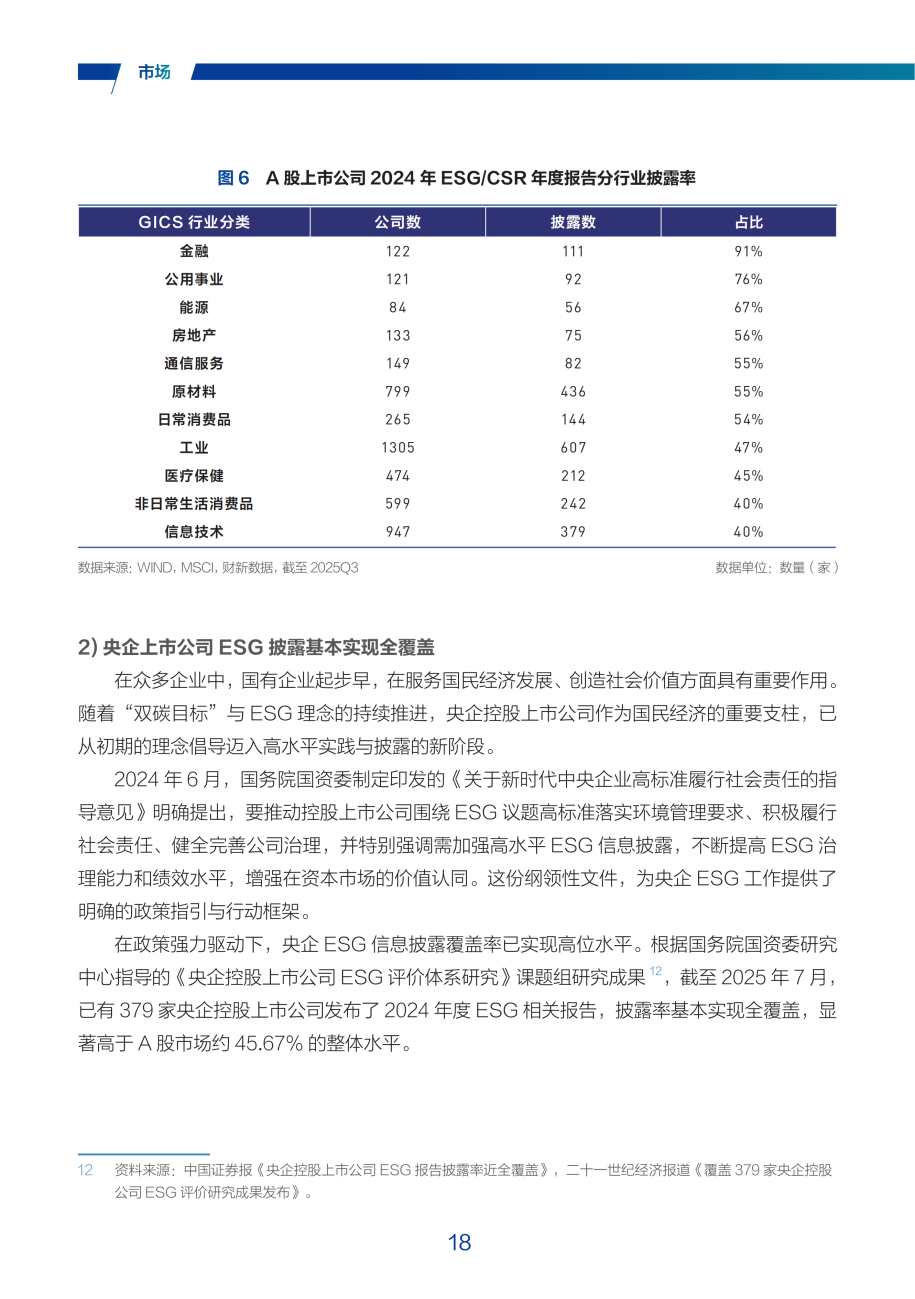 这一系列举措构建起覆盖全国、衔接国际的可持续披露体系,为企业ESG管理提供了清晰的制度指引,在政策推动下,A股上市公司ESG信息披露水平持续提升。截至2025年9月,披露ESG相关报告的公司数量突破2500家,披露率达到46%。其中,金融行业覆盖率超过90%,央企上市公司基本实现全覆盖,展现出重点领域在信息披露方面的先行态势。