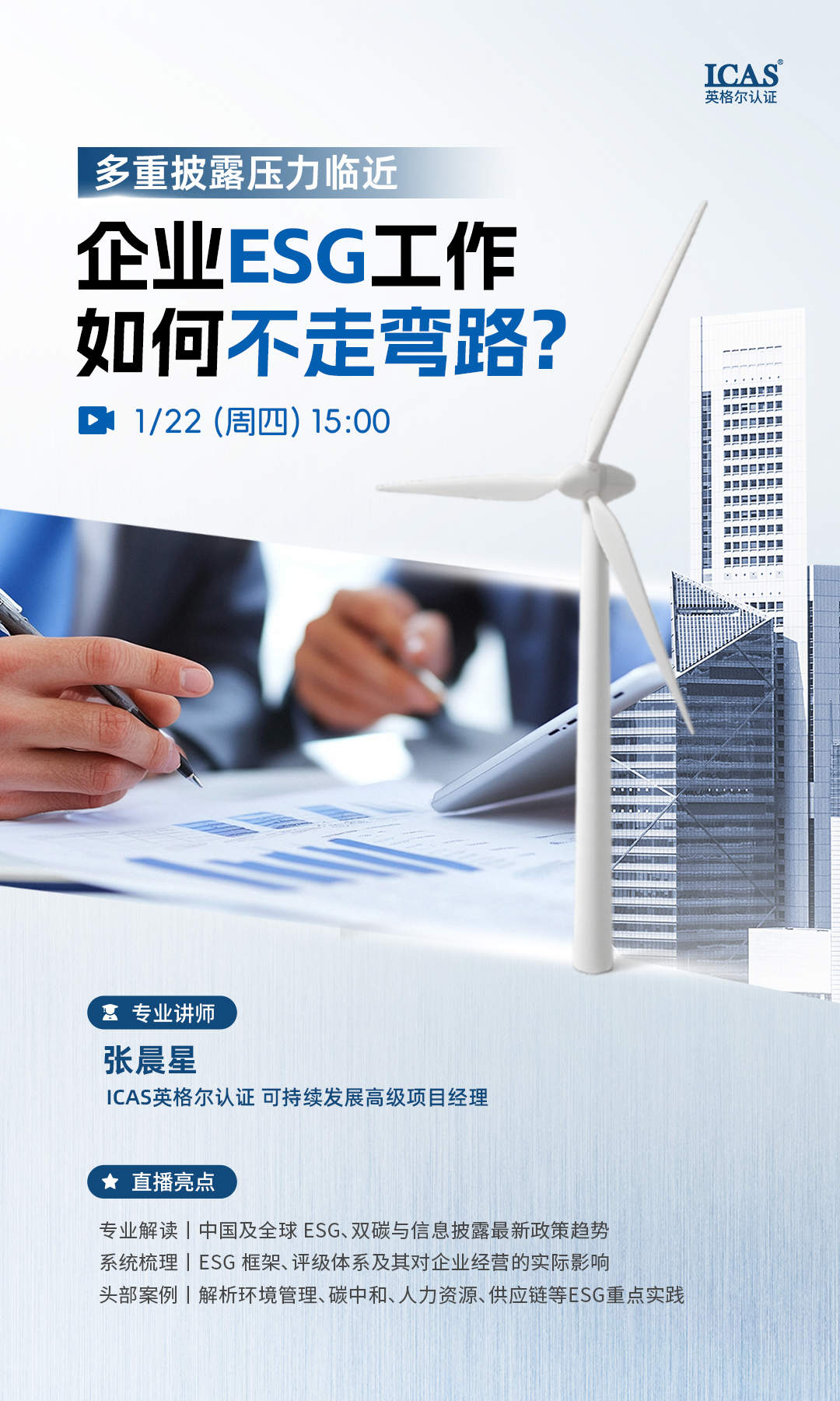 4、碳排放、供应链、人力资源等议题如何真正落地,而非流于形式? 为了助力企业解决ESG推进过程中的重难点,ICAS英格尔认证特邀可持续领域专家,推出本场ESG专题直播。帮助企业建立清晰、合规、标准、可持续的ESG管理思路。