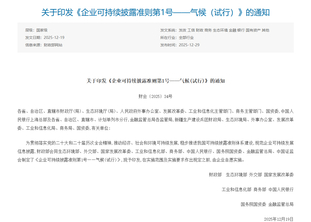 2025年12月,财政部会同生态环境部、外交部等九部门联合制定了《企业可持续披露准则第1号——气候(试行)》(以下简称《气候准则》),这是继《企业可持续披露准则——基本准则(试行)》后,我国可持续披露准则体系中的首个具体准则,标志着企业气候信息披露进入了标准化、规范化的新阶段。