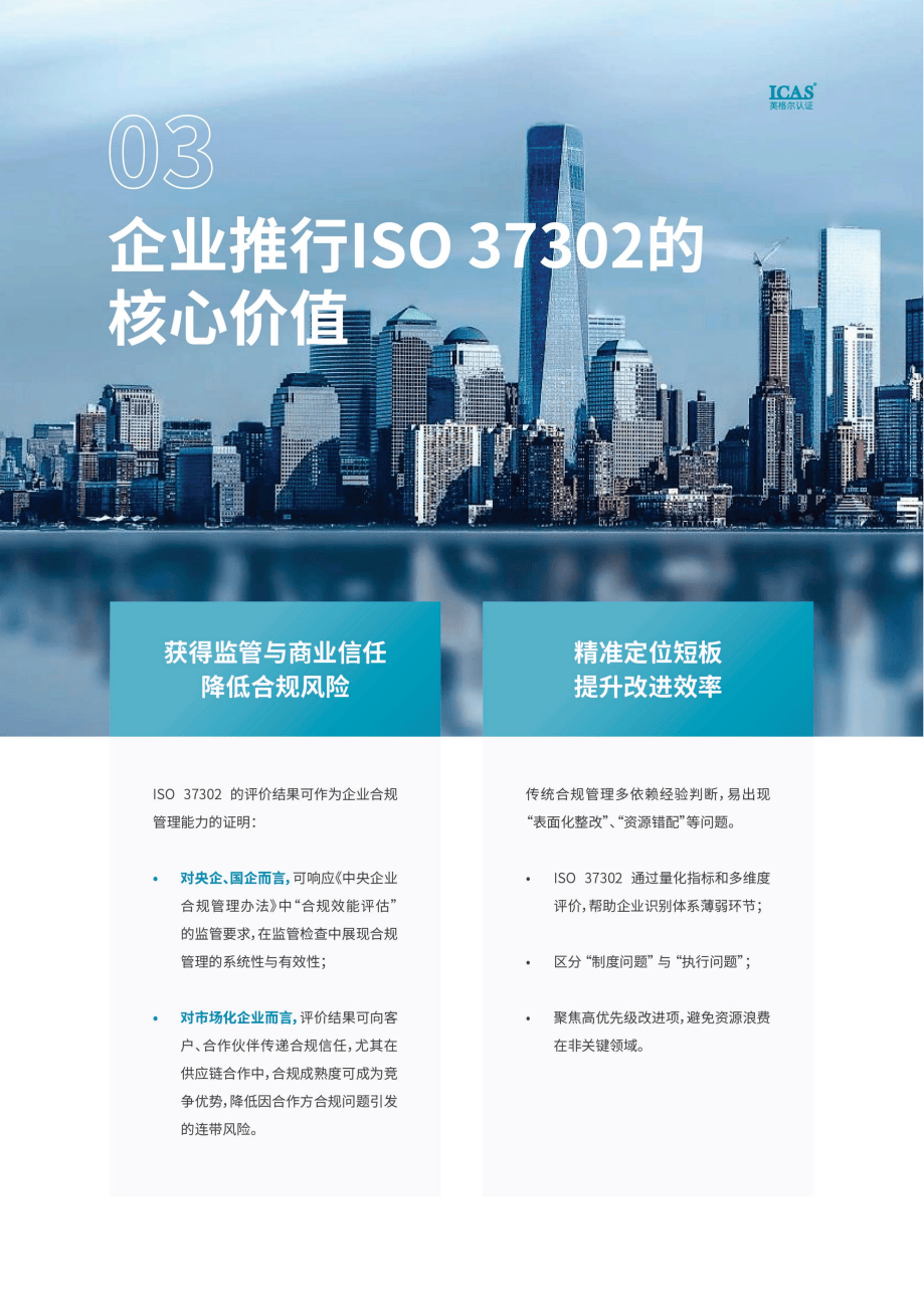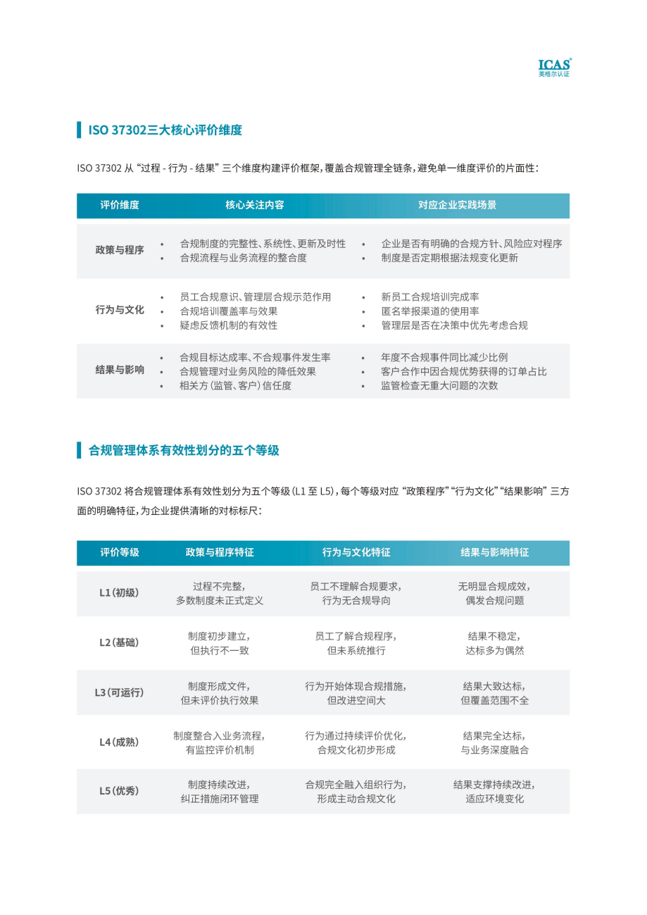 当前,全球监管环境持续收紧,市场竞争日益激烈,企业面临的合规压力涉及行业标准、商业道德等多重维度。一套行之有效的合规管理体系,已经成为企业稳健经营和可持续发展的重要基石。 2025年,国际标准化组织正式发布ISO 37302:2025《合规管理体系有效性评价指南》,为企业提供了一套具备可操作性、可量化、多维度的评价框架。ICAS英格尔认证结合多年在合规领域的实践积累,撰写并发布了《ISO 37302合规管理体系有效性评价》白皮书,帮助企业理解标准、掌握方法,实现合规管理的价值落地。 扫描下方小程序码一键获取: ISO 37302:从体系建设到效果验证 ISO 37302与较早发布的ISO 37301共同构成了合规管理的完整闭环。ISO 37301主要关注如何建立合规管理体系,明确各项核心要素与框架要求;而ISO 37302则着重解决体系运行后的关键问题:如它是否真正有效?哪些环节存在不足?应如何持续改进? 图源:《ISO 37302合规管理体系有效性评价》白皮书 这套标准强调以风险为基础、以过程为路径,围绕“政策与程序、行为与文化、结果与影响”三个维度展开评价。这意味着,企业需要审视制度是否健全、文件是否更新,更要考察合规是否融入员工行为、是否形成积极文化,以及最终是否为业务带来实质性风险降低或价值提升。 图源:《ISO 37302合规管理体系有效性评价》白皮书 ISO 37302还将合规管理体系的有效性划分为五个渐进等级,从初级到优秀,每一级都对应制度、行为和结果三个方面的具体表现。企业可以通过对照,清晰识别自身所处阶段,明确后续提升路径,避免盲目投入与重复建设。 想知道你的合规体系是否真正有效? 点击获取ISO 37302评价框架与实施路径 企业为何需要开展合规有效性评价 对于国有企业及中央企业,近年来监管机构逐步加强对合规管理效能的考核。《中央企业合规管理办法》明确要求企业开展合规有效性评估,提升管理透明度与系统性。依据ISO 37302开展的评价工作,能够为这类企业提供结构化的自证工具,帮助其在监管沟通中展现合规成果,巩固信任基础。 图源:《ISO 37302合规管理体系有效性评价》白皮书 对上市公司及各类市场化企业而言,合规能力正逐渐成为商业合作与供应链选择中的重要考量。一份基于国际标准、由专业机构出具的合规有效性评价报告,能够向合作伙伴、投资者传递可靠信号,增强市场信心,甚至在招标采购、跨境合作中转化为竞争优势。 图源:《ISO 37302合规管理体系有效性评价》白皮书 此外,借助ISO 37302所提供的量化指标与多维视角,企业能够跳出以往依赖主观判断的局限,定位合规体系中的短板与薄弱环节,识别到底是制度缺失、执行不力,还是其他原因。由此,企业可将有限资源集中投入于关键、急需改进的领域,提升合规工作的整体效率与回报。 启动ISO 37302合规有效性评价的关键步骤 企业若计划开展合规有效性评价,可根据自身目标灵活选择实施方式。如果主要是为了摸底现状、推动内部改进,可优先采用自评工具进行初步诊断。ICAS英格尔认证基于ISO 37302开发的自评表,涵盖三大维度共23项关键指标,能帮助企业快速完成第一轮自我检视。 图源:《ISO 37302合规管理体系有效性评价》白皮书 如果评价目的在于满足外部监管要求或用于商业证明,则建议引入具备资质的第三方机构进行独立评价,以保证结果的专业性与公信力。对于体系较为复杂或业务覆盖较广的企业,也可考虑采取分阶段、分模块的方式推进,如先针对采购、销售等关键流程进行试点评价,再逐步扩展到其他业务模块。 图源:《ISO 37302合规管理体系有效性评价》白皮书 在实施过程中,资料准备是否充分直接影响评价效率。企业应提前整理合规相关的制度文件、过程记录与绩效数据。同时需要强调的是,合规管理从来不是单一部门的职责。真正有效的评价必须让业务部门深入参与,从访谈调研到流程查验,直至后续改进落地,都需要业务团队的持续协作。 ICAS英格尔认证作为行业资深认证机构,在合规管理体系方面具有多年研究和丰富的实践案例,为客户提供全流程、全周期的专业服务,助力各类企业在发展的过程中行稳致远。ICAS英格尔认证围绕ISO 37302构建了覆盖“现状诊断—量化评价—问题分析—改进支持”的全流程服务模式,可根据企业类型、行业特点与发展阶段进行适配调整,助力央企、上市公司及中小企业企业系统、全面企业通过开展ISO 37302管理体系认证,能够清晰地了解自身合规管理体系的现状,发现存在的问题和不足,为合规管理改进和提升提供有力依据,以此实现规范化管理和高质量发展。 图源:《ISO 37302合规管理体系有效性评价》白皮书 ICAS英格尔认证成立于2000年,是中国第一批获得官方认定的第三方独立认证机构,获得国际“UKAS”(英国皇家认可委)、ANAB(美国国家认可委)和国内“CNAS”(中国合格评定国家认可委员会)三重认可,是上海市高新技术企业,“专精特新”企业、科技小巨人企业。 ISO 37302的推出,标志着企业合规管理进入了重实效、可衡量、促融合的新阶段,合规不再是静态的制度集合,而是能够持续检验、动态优化、真正为业务护航的管理体系。立足这一标准,企业可进一步夯实风控基础,提升管理成熟度,在日趋复杂的经营环境中构建长期可信的发展优势。 扫码如下小程序码,一键获取《ISO 37302合规管理体系有效性评价》白