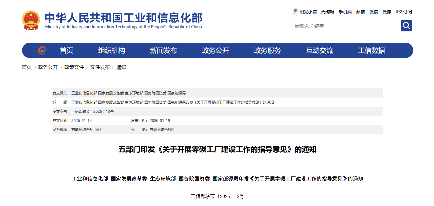 近日,工业和信息化部联合国家发改委等五部委联合印发《关于开展零碳工厂建设工作的指导意见》。这一政策的发布,标志着我国制造业绿色低碳转型迈入“零碳实操”新阶段。 工信部联节〔2026〕13号 工业和信息化部 国家发展改革委 生态环境部 国务院国资委 国家能源局印发《关于开展零碳工厂建设工作的指导意见》的通知 作为深耕检验检测认证领域的专业机构,ICAS英格尔认证始终紧贴国家战略,致力于通过专业的评价与认证服务,挖掘工业领域节能降碳潜力。我们认为,“零碳工厂”不再是企业的“选修课”,而是培育新质生产力、应对国际碳关税的核心“必修课”。 请各相关企业密切关注《意见》中的建设标准与评价指标。ICAS英格尔认证将全力配合企业落实文件精神,提供从碳核查到零碳评价的全链条技术支持,确保政策红利转化为企业的竞争红利。 扫码立即获取丨官方发布5项认证规则释义 了解更多详情